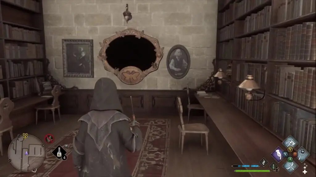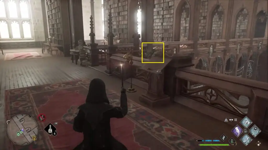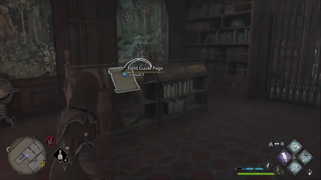 You will find a blank painting on the upper level of the library as shown in the picture below. Use Lumos and it will show a location. Now go near the spiral staircase to find a Moth as shown in the second picture below. Use Lumos to take it to the painting. This will give you a field Guide Page.