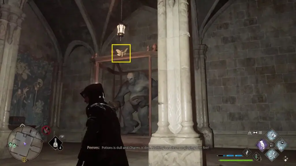 Go through the door on the west side of the Potions Class. Climb down the stairs and open the level 1 locked door at the bottom to enter the Long Gallery. You will find a blank painting on the right side of the Long Gallery as shown in the picture below. Use Lumos and it will reveal a location. Now proceed ahead to the next room and you will find a Moth on top of a Troll sculpture there as shown in the second picture below. Use Lumos to take the Moth to the painting. This will give you the Field Guide Page.