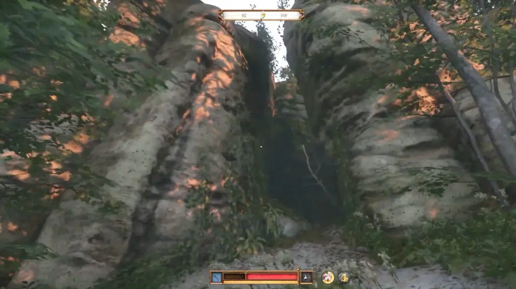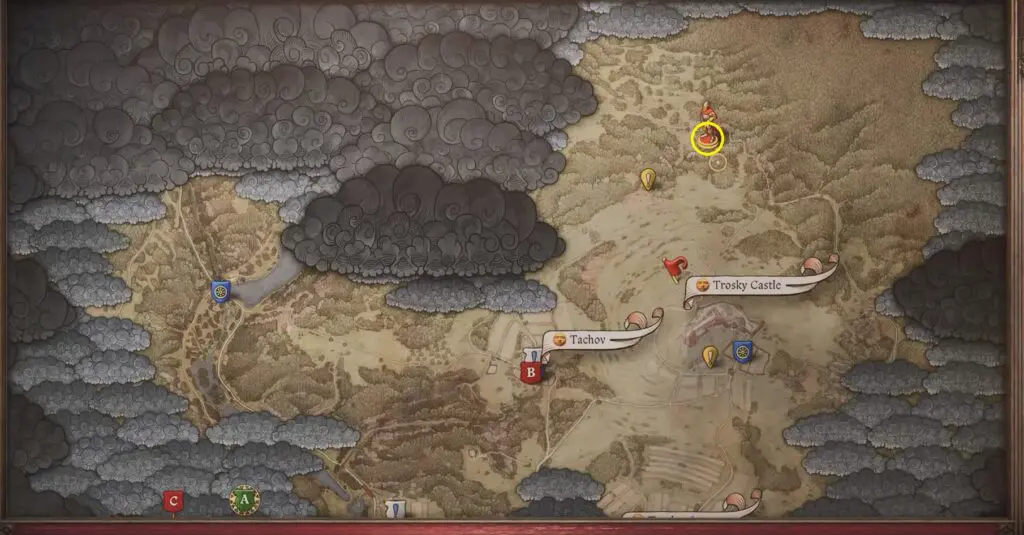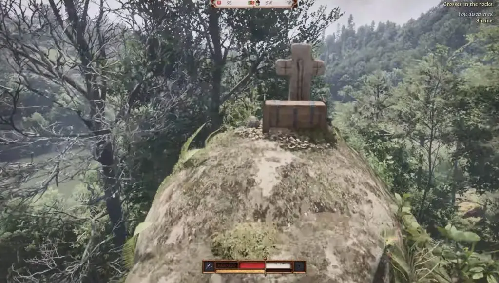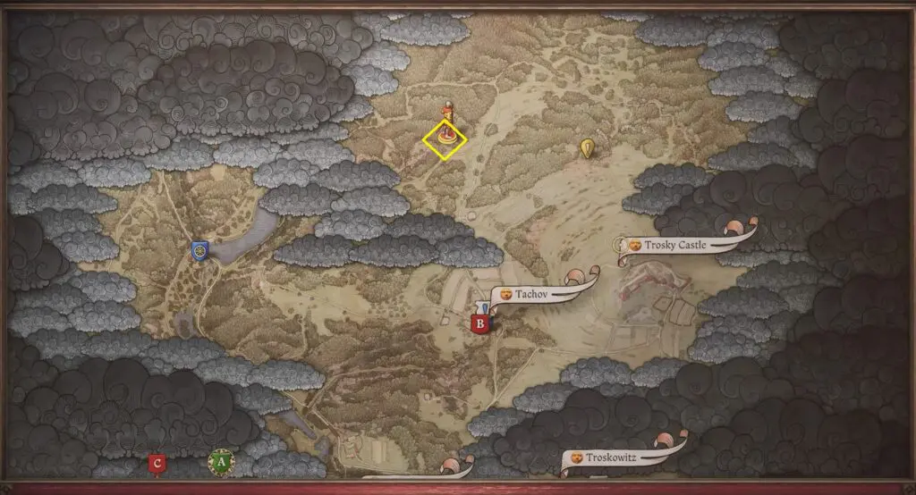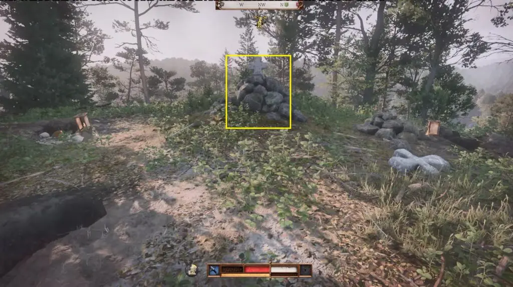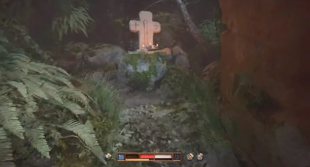 Travel north of Castle Trosky to discover a small opening in the cliffside. Inside, you’ll find a cross. Move the shrine and dig up to find the first piece of Brunswick’s Dagger.