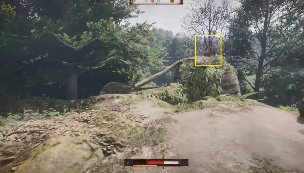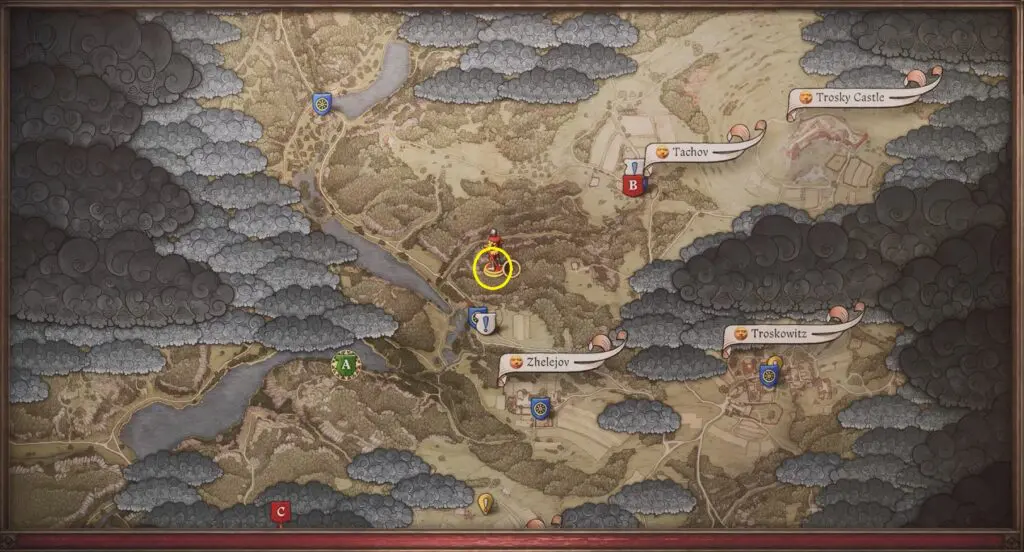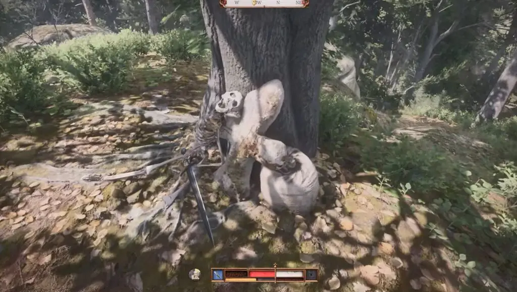 Search the forested area southwest of Tachov town. Among the rocks and trees, you’ll spot a skeleton near a tree—inspect the area to find the third piece of Brunswick’s Armor.