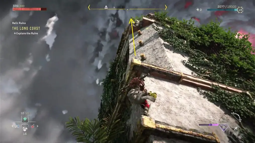 Get into the elevator and take it to the top. Then push the crate outside and leave it there. You will be needing this crate later. After that, go out through the wall on the right side. Climb up the ledges here to reach the top of the ruin as shown in the picture below.