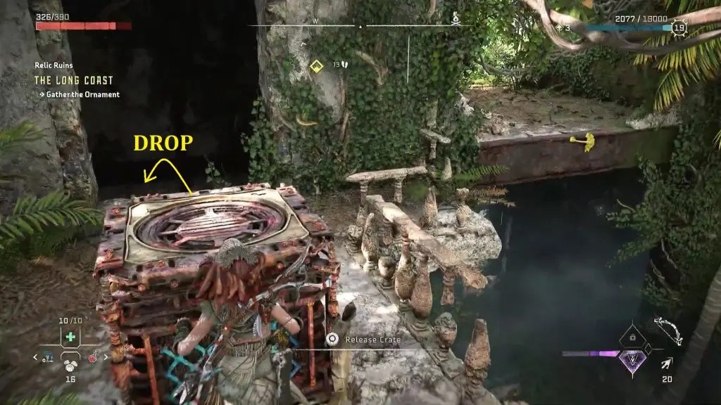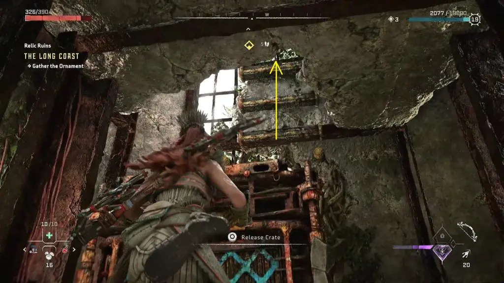 Crate-1 will be there on the top of the elevator, where you dropped it before. Jump on top of Crate-1 and climb up the ledges inside the elevator shaft to reach the ornament as shown in the pictures below. Pick up the ornament to complete the relic ruin.