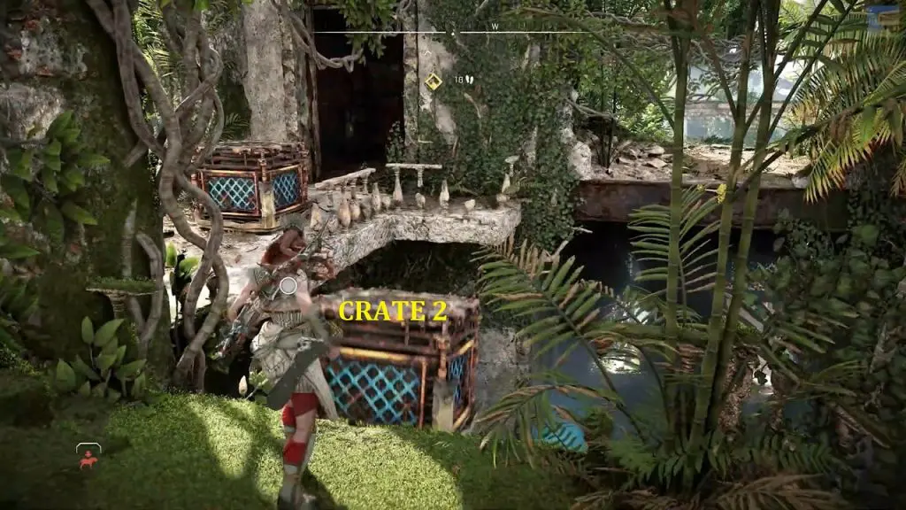 From the grapple point, turn around and jump to the platform in front of it. Then use the pull caster to drop down the crate through the hole on the platform as shown in the picture below.