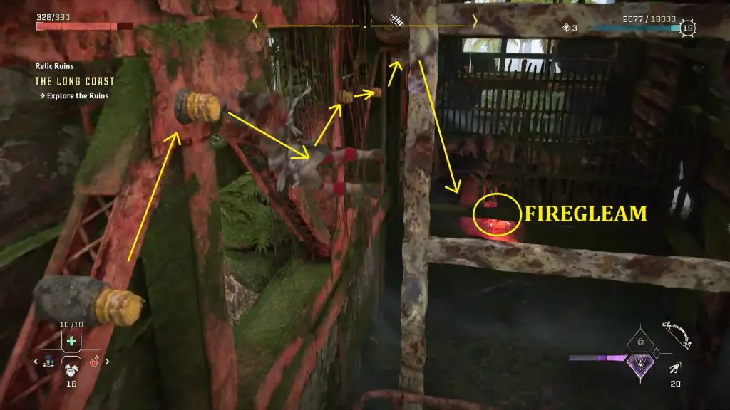 Go to the end of this platform, where you will find several ledges. Jump on the ledges to reach the firegleam as shown in the picture below. Ignite the firegleam to blow up the wall.