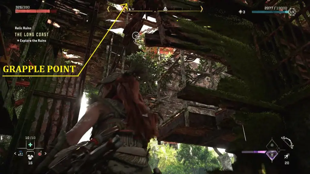 Then immediately go out through the blown-up wall and look up to find a grapple point as shown in the picture below. This grapple point appeared because of the lever that you pulled before. Quickly grapple up before the grapple point disappears.