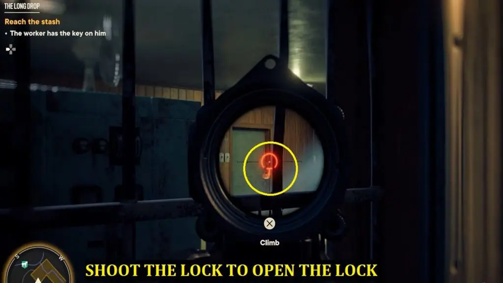 Head around the back of the locked building by climbing onto the roof to reach the other side. Now, look inside through the window, you’ll be able to see a lock you can shoot to open the door.