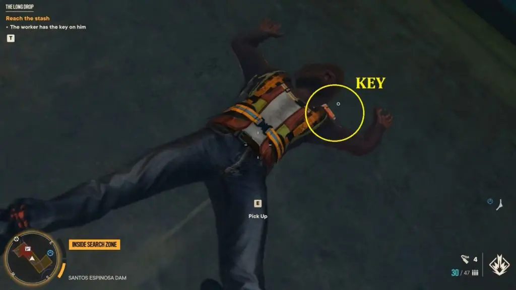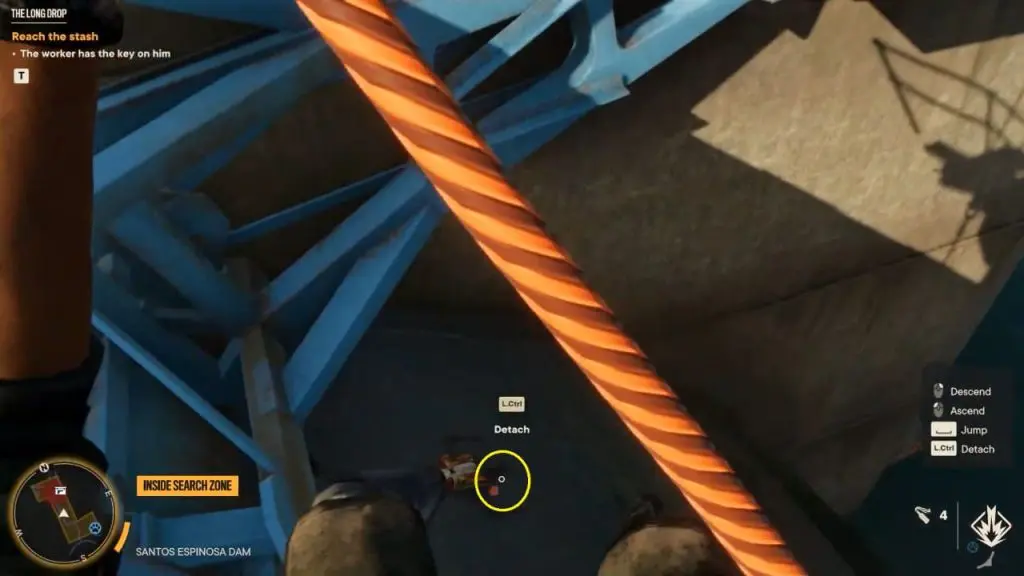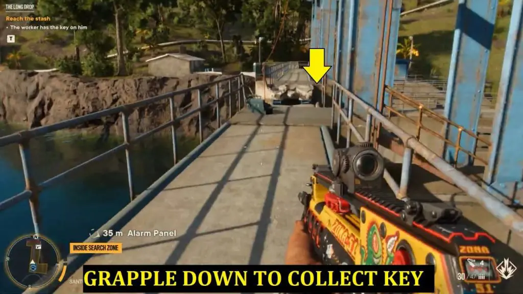 Once you’ve interacted with all of the switches in the proper order, the dam gate will open and you’ll be able to grab the key. Head outside and use the grappling point on the dam bridge to rappel down to the worker’s body that has stuck on the dam. Grab his key and grapple back up.