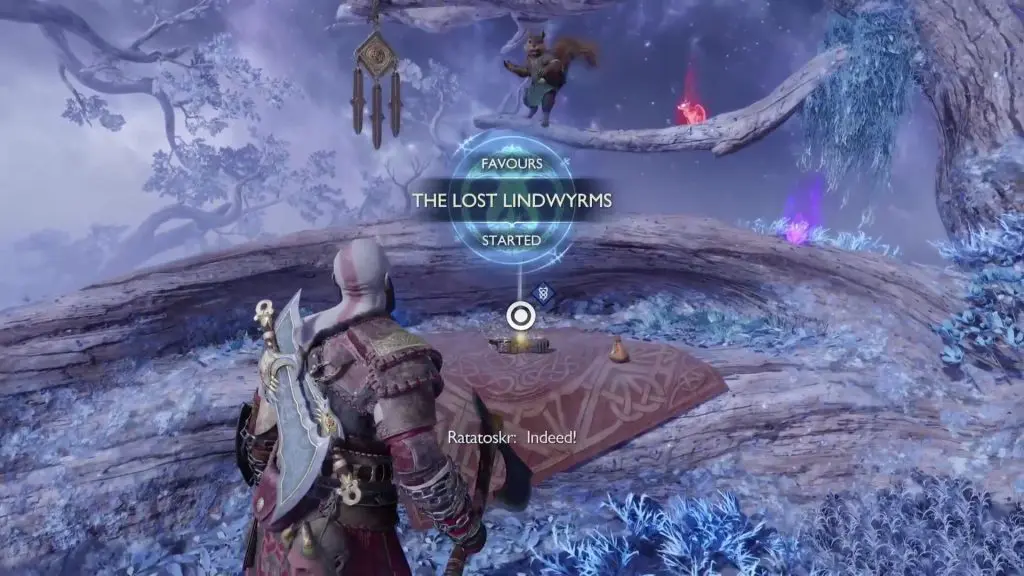 This guide shows the complete walkthrough for The Lost Lindwyrms Favor/ Side Quest in God of War Ragnarok. You get the quest by talking to Ratatoskr in Sindri’s House after completing Main Story Mission 9. Hit the chime with your axe to call Ratatoskr. Speak to him and he will give you a trap to capture the Lindwyrms.