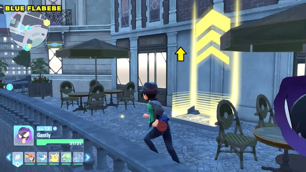 Next, travel to the area shown on the map. You’ll need to climb up a building with a ladder on its side. At the top of the building, you’ll find Blue Flabebe near blue flowers.