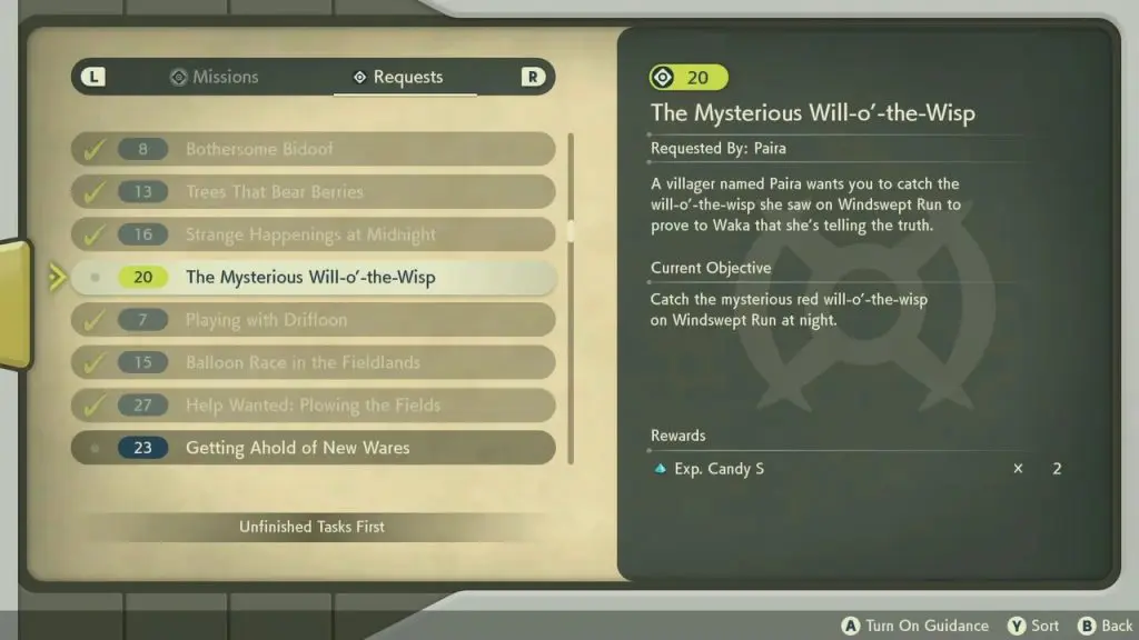 This guide shows the complete walkthrough of “Request 20: The Mysterious Will-o-the-Wisp” in Pokemon Legends Arceus. For this request, you will need to find and catch the Will-o-the-Wisp in Windswept Run.