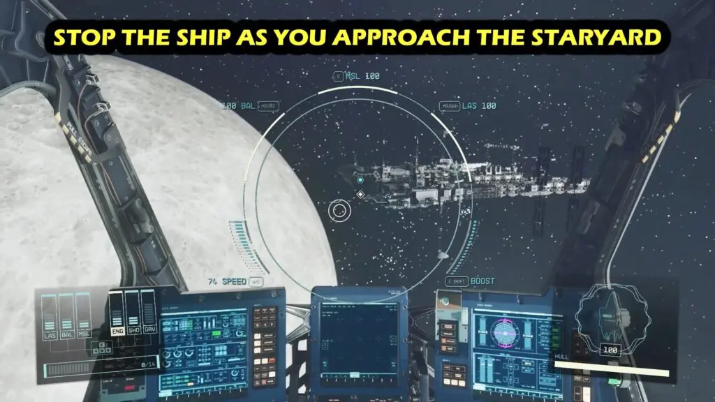 When you come near enough to the Nova Galactic Staryard, you’ll be able to see the “dock” prompt on the screen. Press button R to dock successfully.