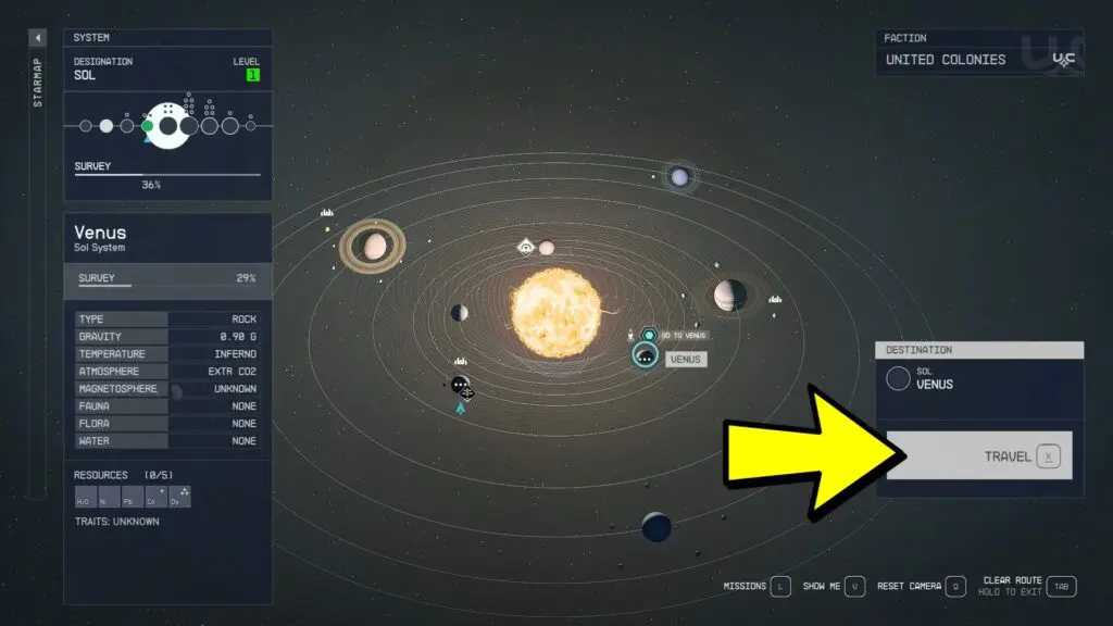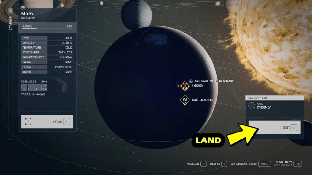 Go to your spacecraft and set a course for Mars in the Sol system. Once you’re in orbit around Mars, choose Cydonia as your destination.