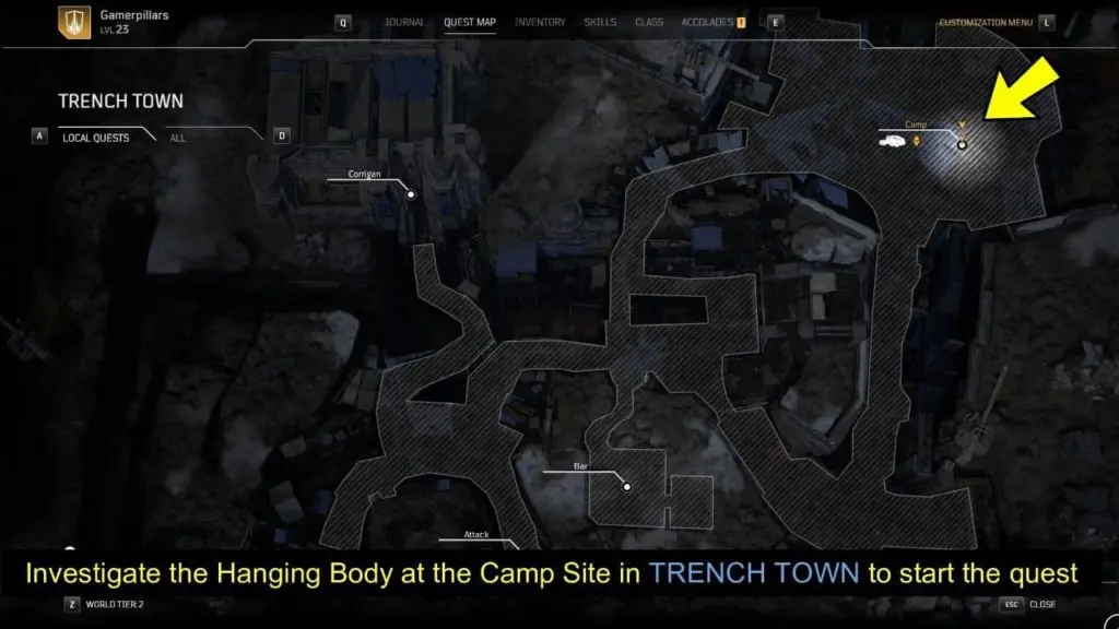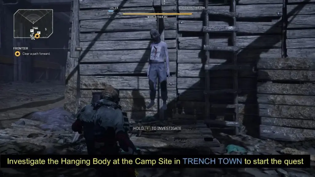 - Investigate the hanging body near the campsite in Trench Town.