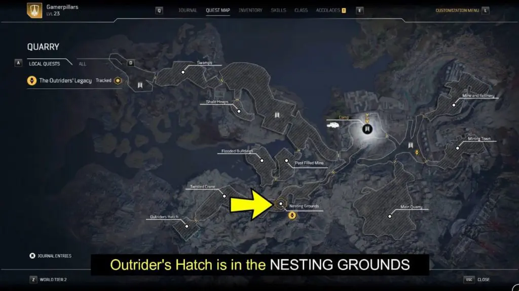 - Outriders’ Hatch is in the Nesting Grounds area (in Quarry region).