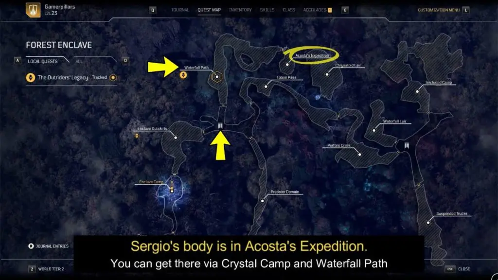 - Sergio Acosta’s body is in Acosta’s Expedition. Clear the area and investigate his body.