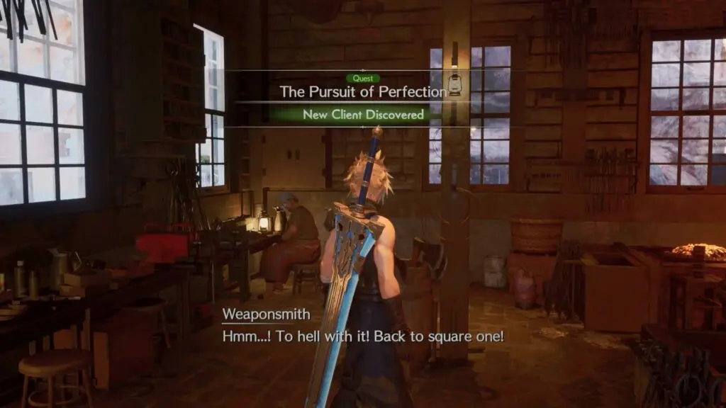 To begin the subquest, go to the Gongaga Village Community Noticeboard or speak with Weaponsmith. He will tell the player he wants to craft the greatest weapon ever. But need help to find the essential elements required to craft the weapon.