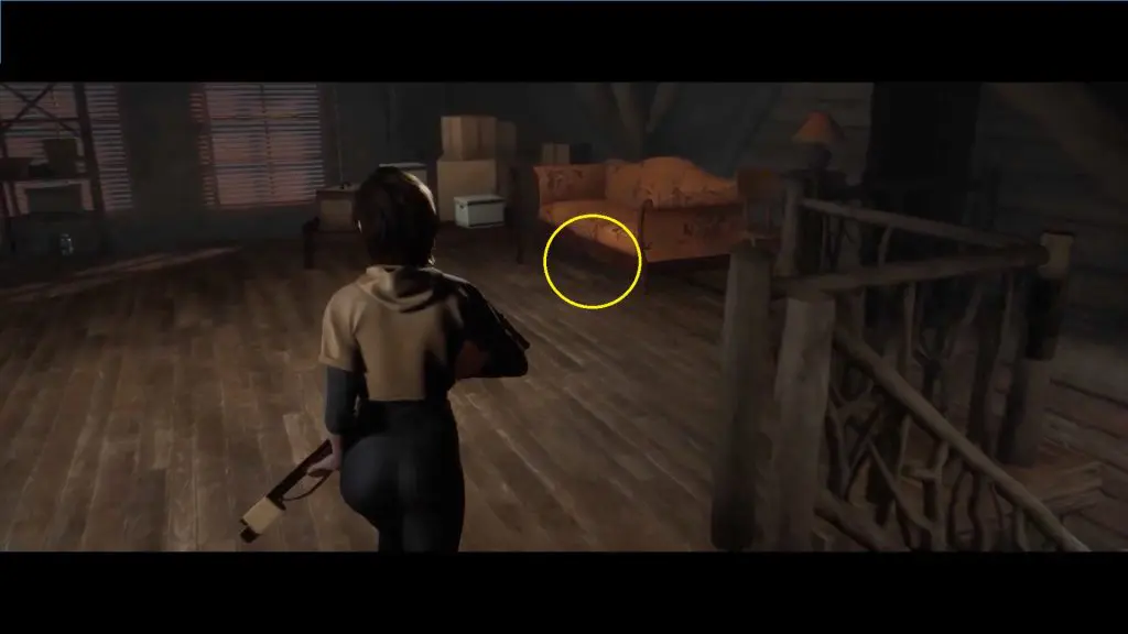 Head outside the classroom and turn left to find stairs. Go up the stairs and interact with the yellow sofa.