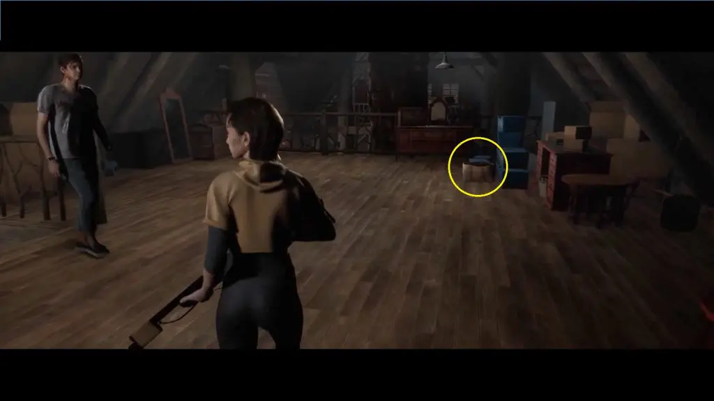 Interact with a bag in front of blue boxes on the same floor. She’ll come upon an old tape. Make Kaitlyn photograph the recording.