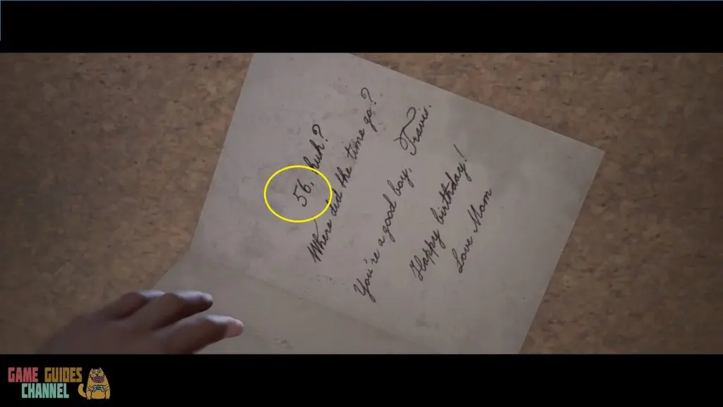 Step 1: Go upstairs using the big wooden stairs and enter the 1st office. Interact with notice board to find a birthday card on the wall that reveals Travis’ year of birth (56).