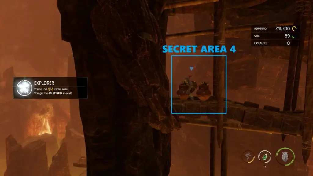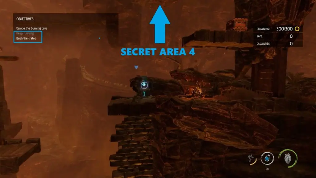 Secret Area 4: You can find the last secret area just before the end part. Continue your journey and after using the third (last pulley) to some down. You will get the objective ‘ Bash the crates‘ and you have to burn the wall using brew bottles.