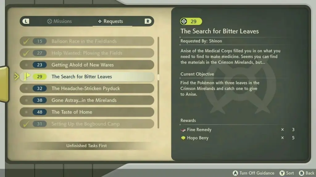 This guide shows the complete walkthrough of “Request 29: The Search for Bitter Leaves” in Pokemon Legends Arceus. For this request, you will have to find and catch a Pokemon with three leaves.