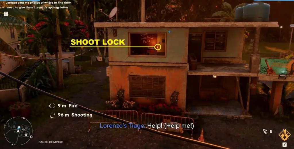This photo is in Santo Domingo, Sierra Perdida. Lorenzo’s Tiago is inside the house shown in the second picture below. Climb up the building in front of the house and shoot the lock through the windows (see the third picture below). Then enter the house through the backside and reach Lorenzo’s Tiago.