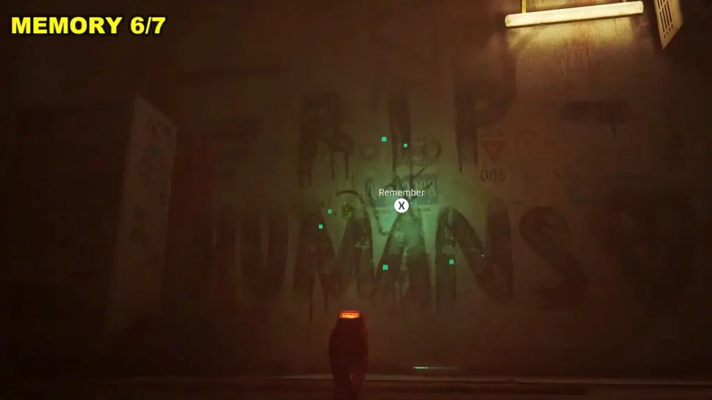 Go down the alleyway past the Super Spirit laundromat. At the end of the alleyway go up the stairs. You will find large writing on the wall that reads RIP Humans. Interact with this wall to collect the memory.