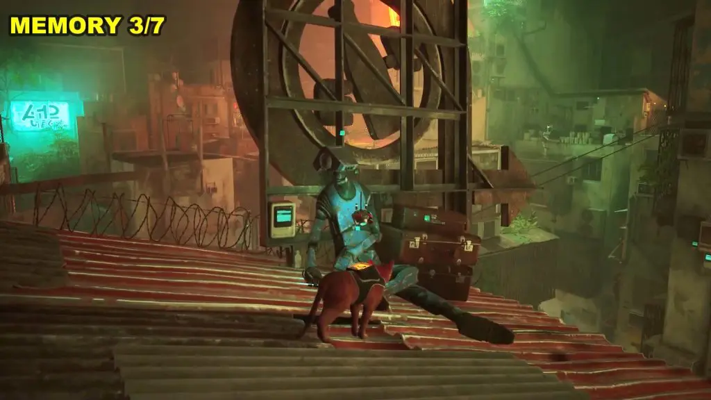 This Slums Memory is on the rooftops of the building with a circular sign on top. This building is just right from the Guardian robot. Make your way to the top of the building to find the dead robot with some luggage bags. Interact with the dead robot to prompt a memory.