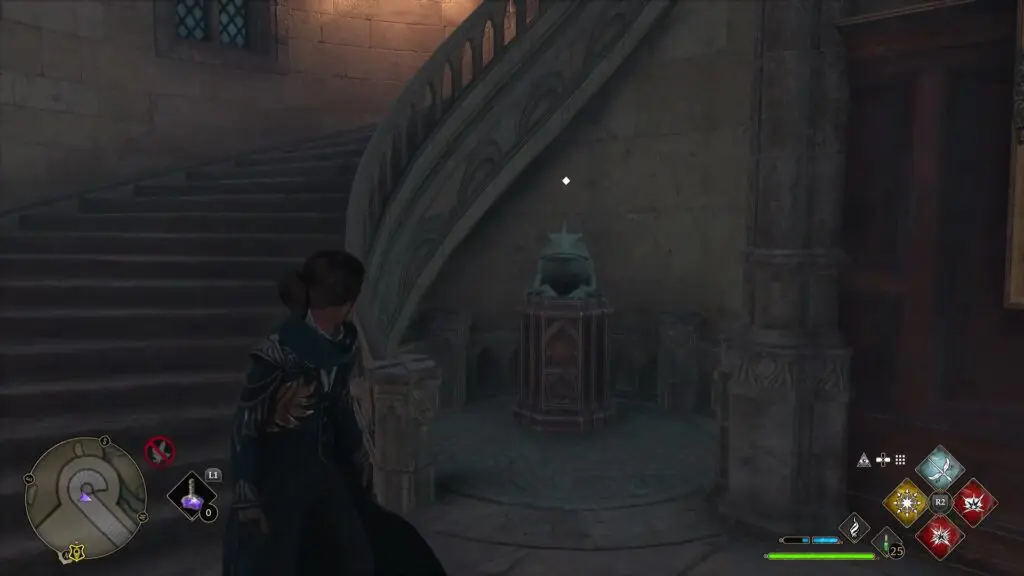 From the Faculty Tower floor flame, go south and climb down the spiral staircase to reach the frog statue as shown in the picture below. Interact with it and it will teleport you to a secret room with the collection chest.