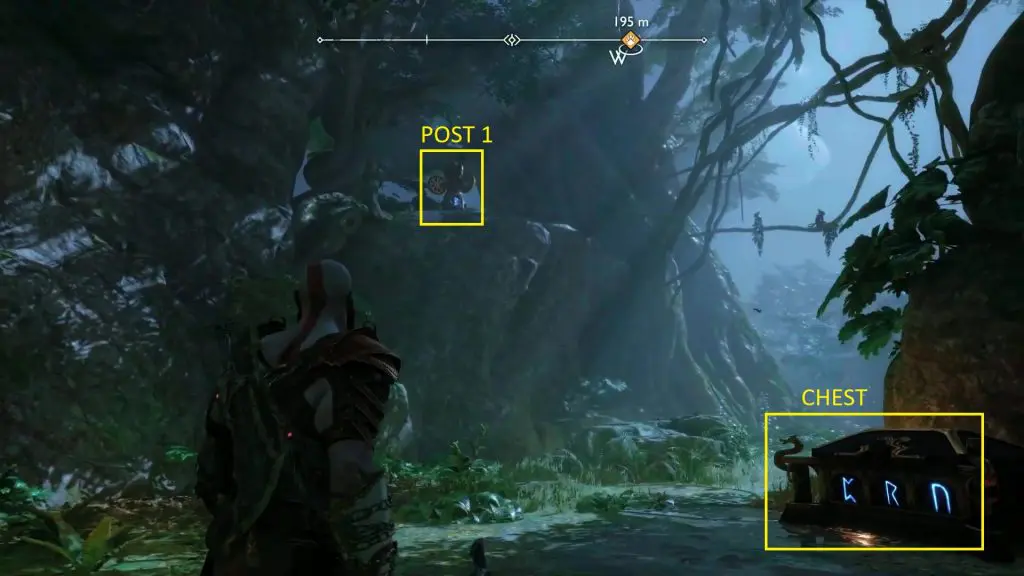 The first post is on the left side of the chest as shown in the picture below. Hit the post until the symbol “C” appears on it.