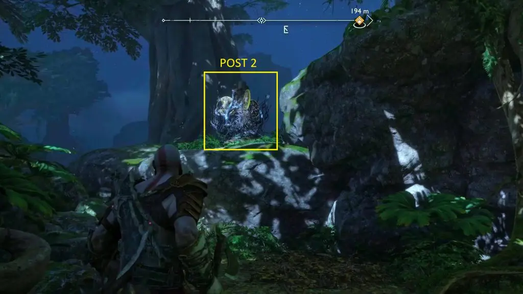 Now turn around and you will see the second post on the left side, covered in vines, as shown in the picture below. Burn the vines with your blade and then hit the post until the symbol “R” appears on it.