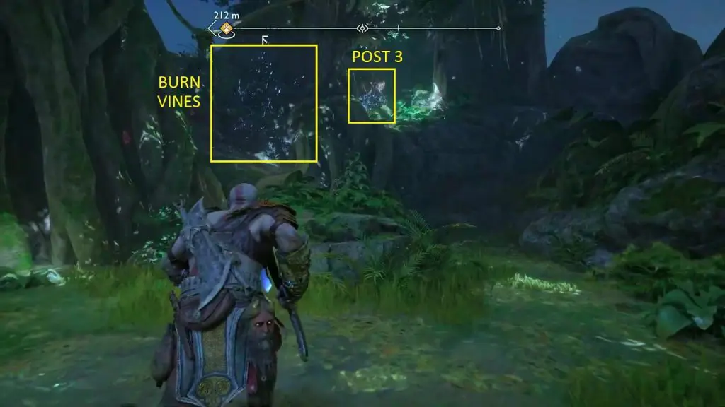 Walk along the mountain wall towards the right and you will see the third post up ahead, covered in vines. These vines extend to the left, up to an approachable distance from you. Burn the vines with your blade and hit the post until the symbol “N” appears on it. This will unlock the chest. Open the chest to get an Idunn Apple.