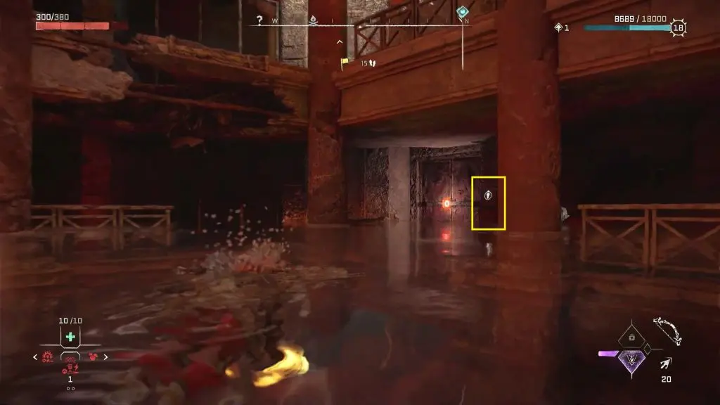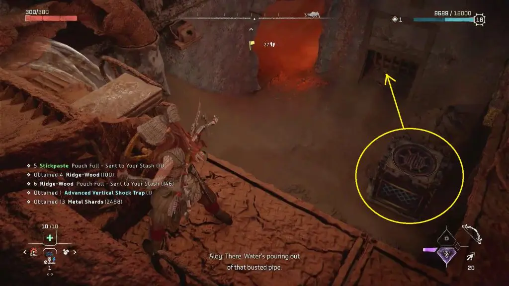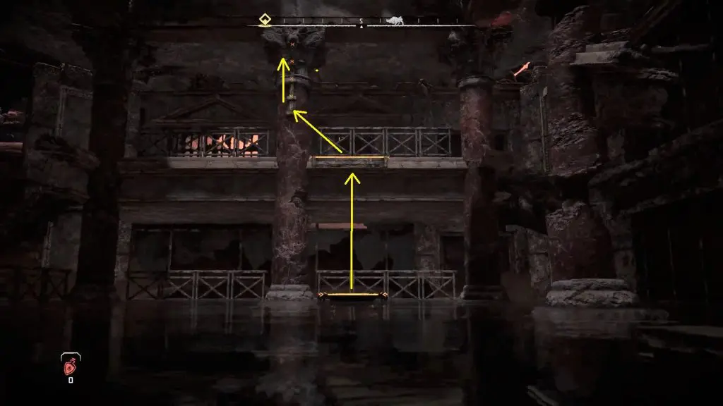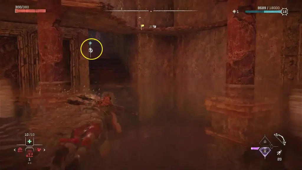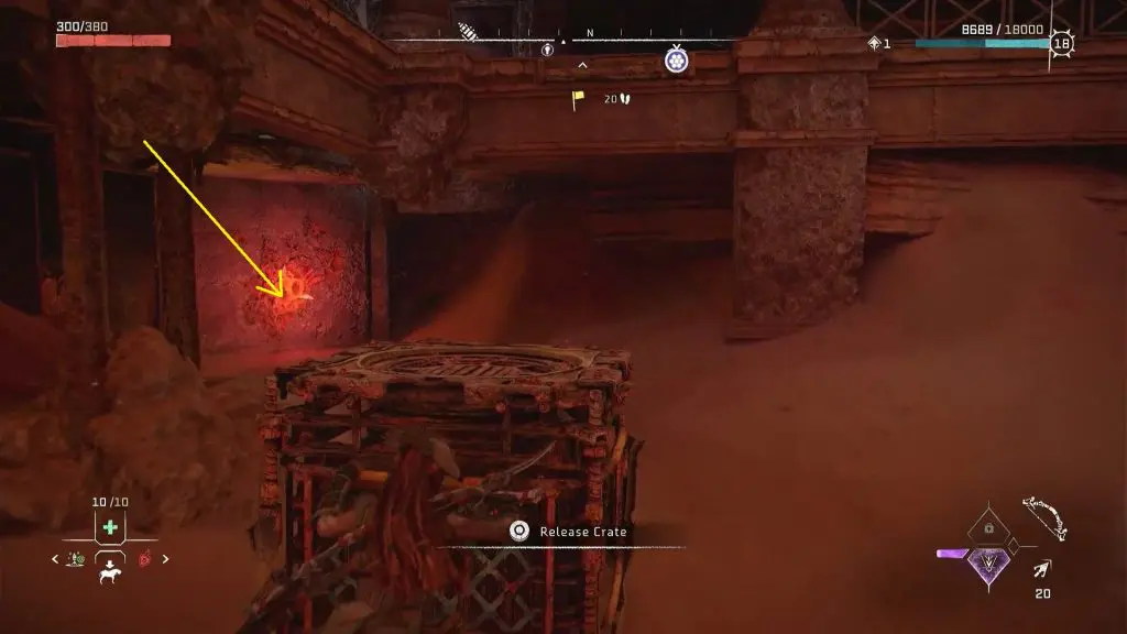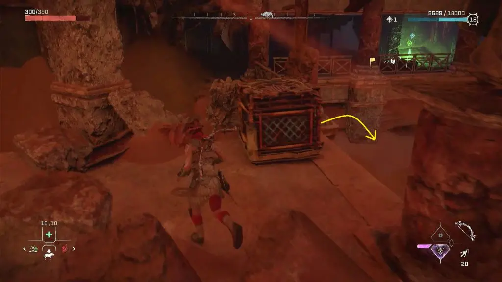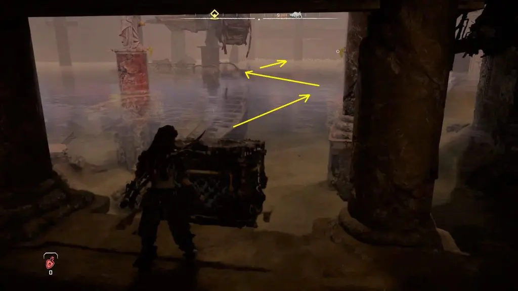 Inside the storage room, you will find a crate. Take out the crate and drop it in the water. You will have to take this crate to the southern edge of the ruin, which is on the opposite side of the storage room as shown in the picture below. You can take the crate there, by standing at the three spots marked by the arrows in the picture below. Stand on the marked spot and use the pullcaster to pull the crate to your location. Then go to the next spot and repeat this until the crate is on the southern edge of the ruin.