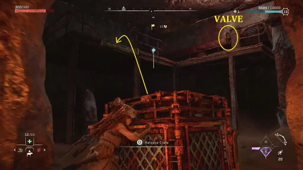 Push the crate through the hole on the wall and place it below the ledge as shown in the picture below. Climb up the ledge and open the valve as shown below.
