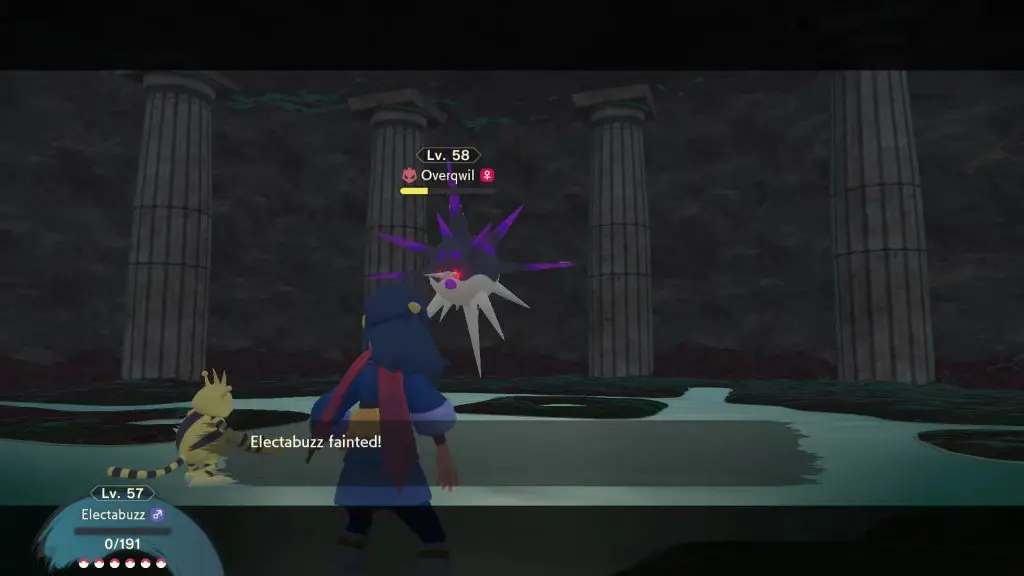 After unsealing the carven, proceed inside to face a Level 58 Alpha Overqwil. Overqwil is an evolved version of Hisui Qwilfish. It is a Dark and Poison-type Pokemon, making it vulnerable to Ground-type attacks and immune to Psychic-type moves. You can bring Garchomp or a Snorlax for this fight as it takes 2x damage from Ground-type moves. Garchomp learns Earth Power at level 29, while Snorlax learns High Horsepower at level 37.