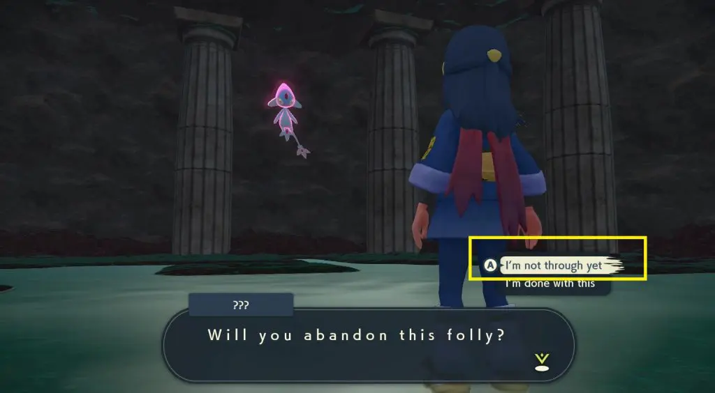Azelf will communicate whether to abandon or continue throwing balms after a few throws. Select the “I’m not through yet” option and keep throwing balms at it. Azelf will ask you again a second and third time. Finally, on the fourth try, you will be able to hit Azelf with a balm and complete the trial.