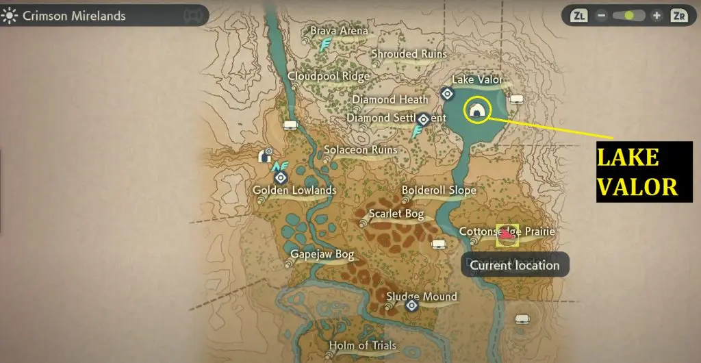 First, you’ll need to head over to the Crimson Mirelands region and then fly towards the northeast where Lake Valor is. I have marked the location on the map below. At the entrance to Lake Valor, a cutscene will play out to unseal the cave.