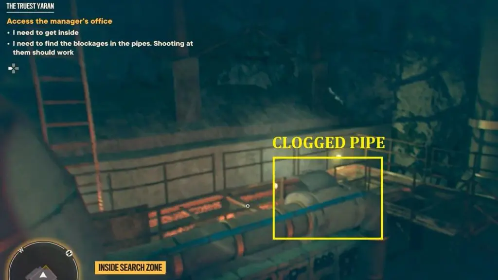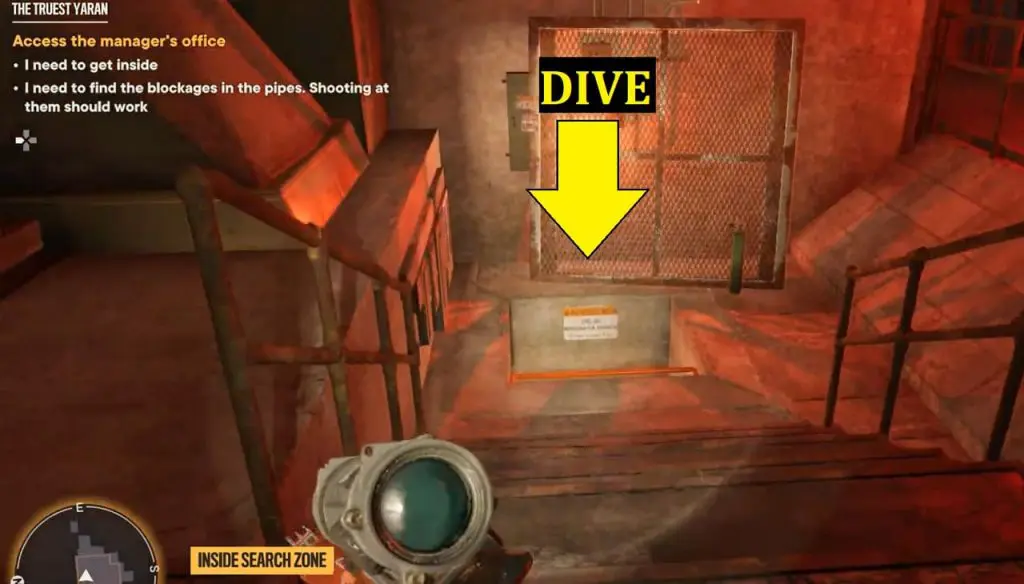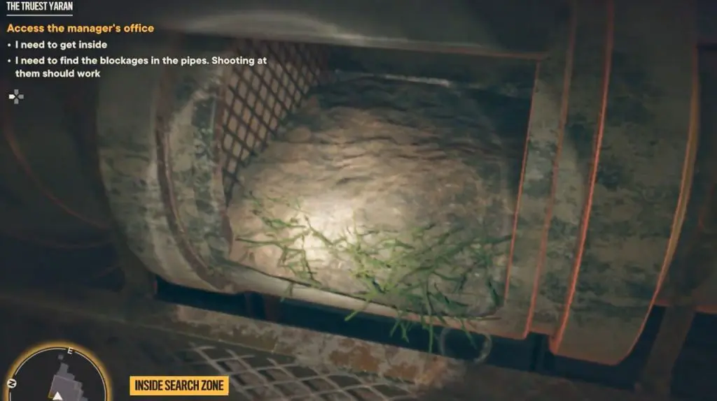 1st Pipe to unclog: Now you need to unclog pipes at two locations. In the same hall with a corpse hanging, you will find an opening on the floor. You can drop down into a flooded area through the opening. Dive deep and search for a pipe with an open lid and dirt on the left side. Use a melee attack on the dirt to remove it and drain out the water.