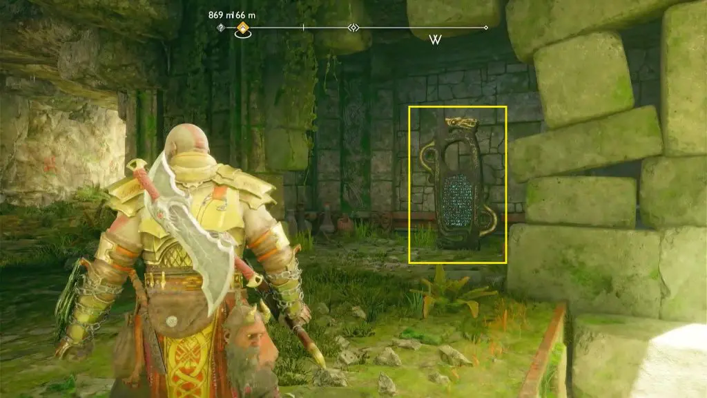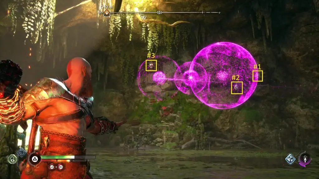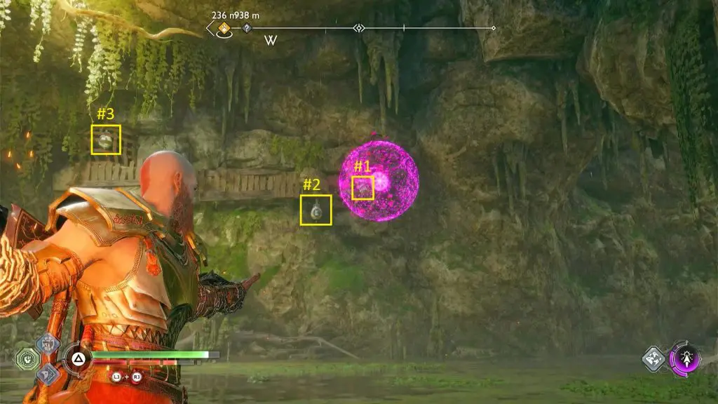 Now shoot purple arrows between the three seals as shown in the picture below. Then throw a grenade at them to destroy the seals. This will unlock the chest. The path to the chest is blocked with golden debris. Destroy the debris with the grenade. Then open the chest to get an Idunn Apple.