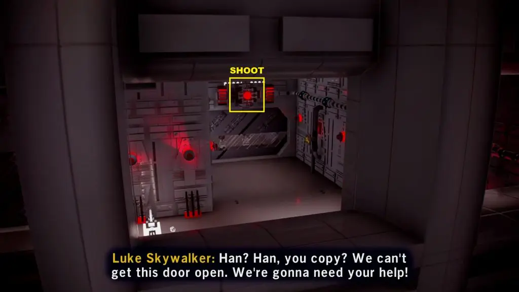 Shoot the button above the door where Luke & Leia are trapped to open the door and complete the challenge.