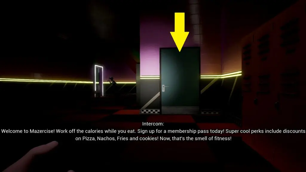 Enter Mazercise. Then go through the door on the left side to reach the backside of the Mazercise. Then turn right and enter the room as shown in the picture below.