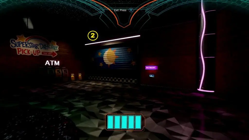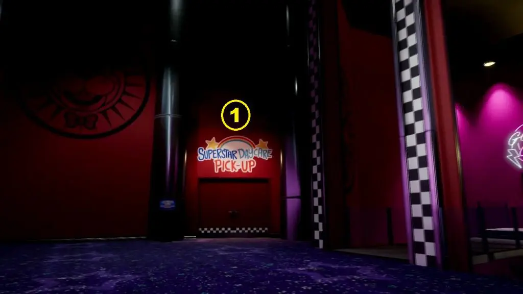 Take the elevator to reach the Daycare Level. Exit the elevator, then turn left and enter the Daycare (Marked as 1 in the map below). The map below also marks other spots through which you will pass to reach the Daycare theater.