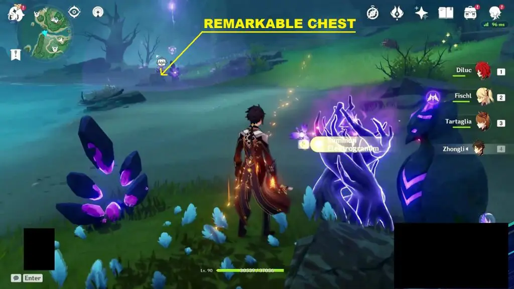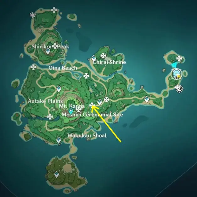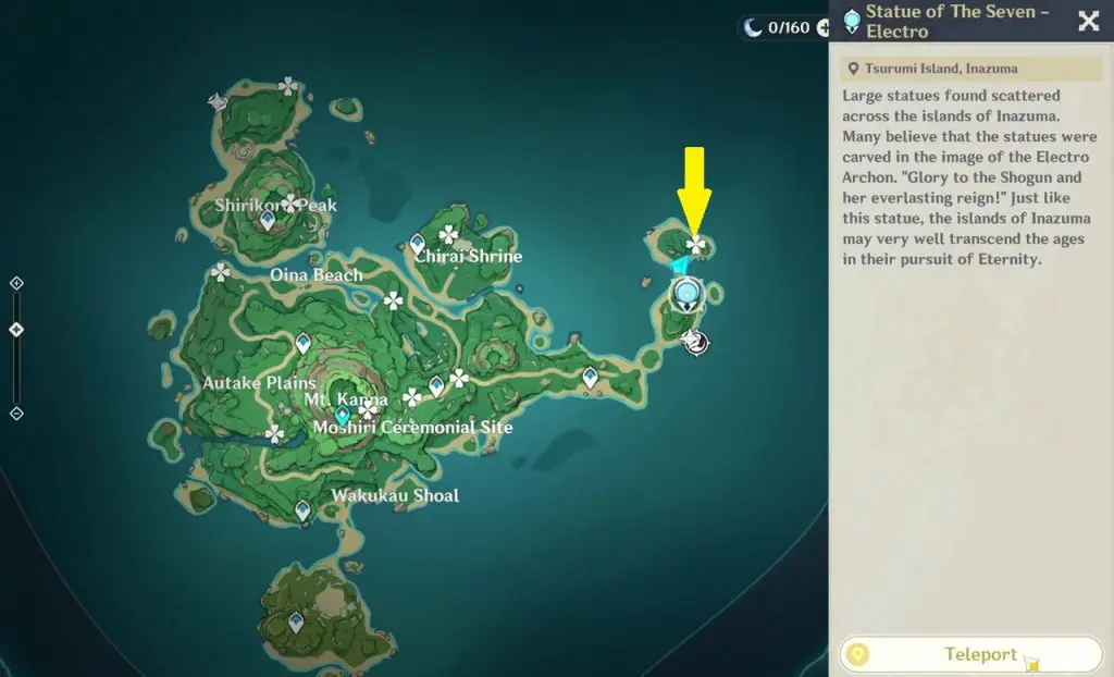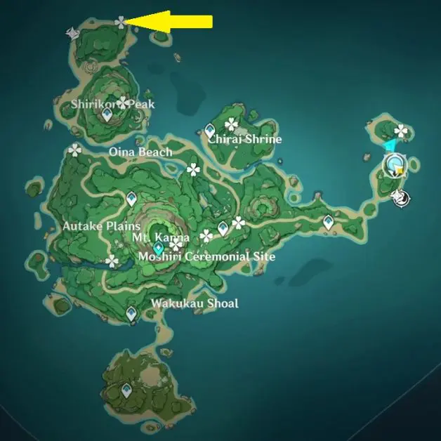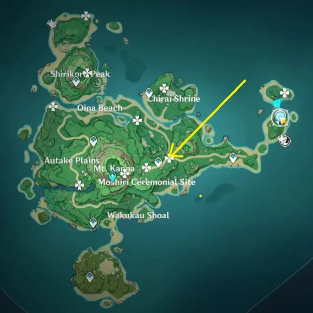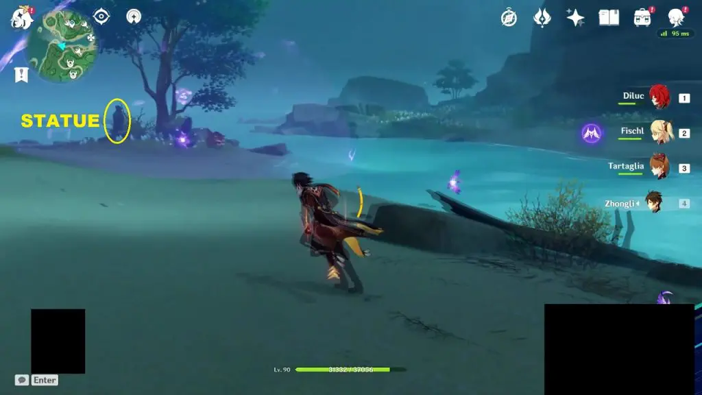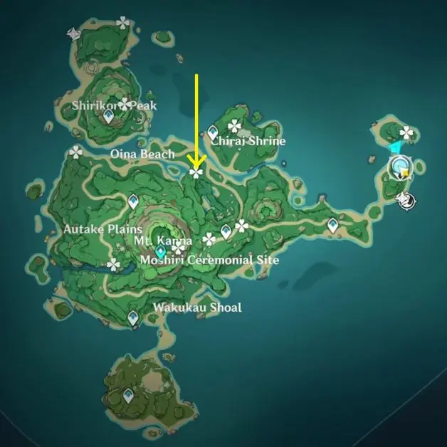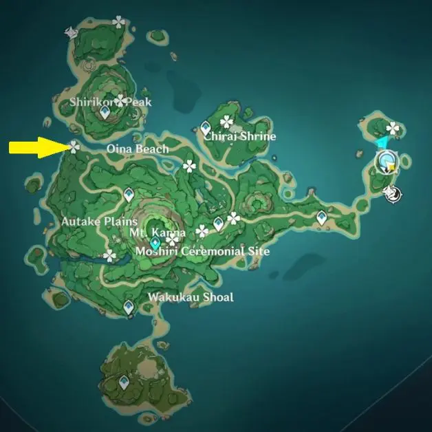 At the highlighted location in Oina Beach, the Thunderbird Statue is inside a Thunder barrier. Summon Electrogranum and go inside the barrier. Then use the ‘Peculiar Pinion‘ gadget in front of the statue. This will reveal an electrogranum plant and a Remarkable Chest inside another Thunder barrier. Summon electrogranum from the plant and then go inside the barrier to get the chest.