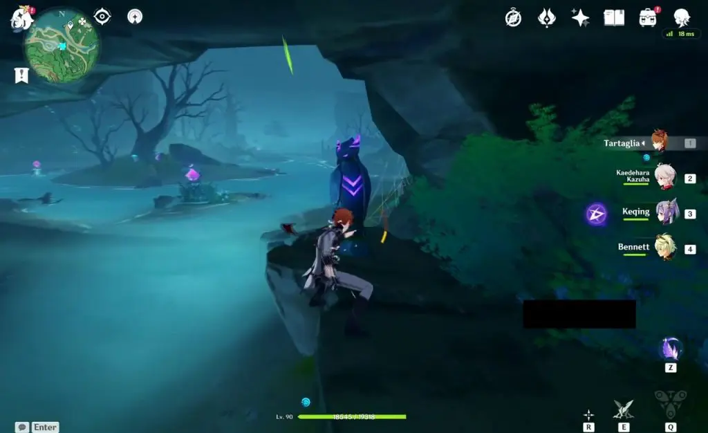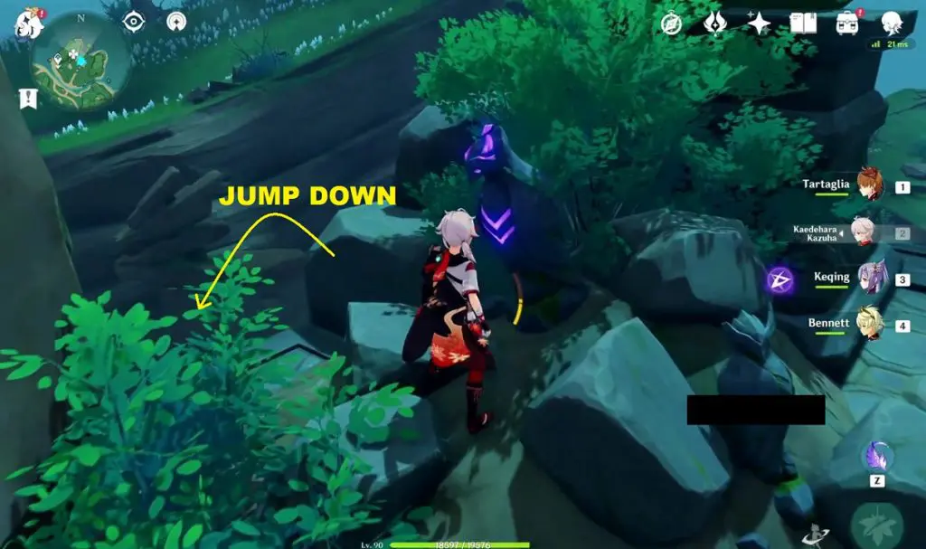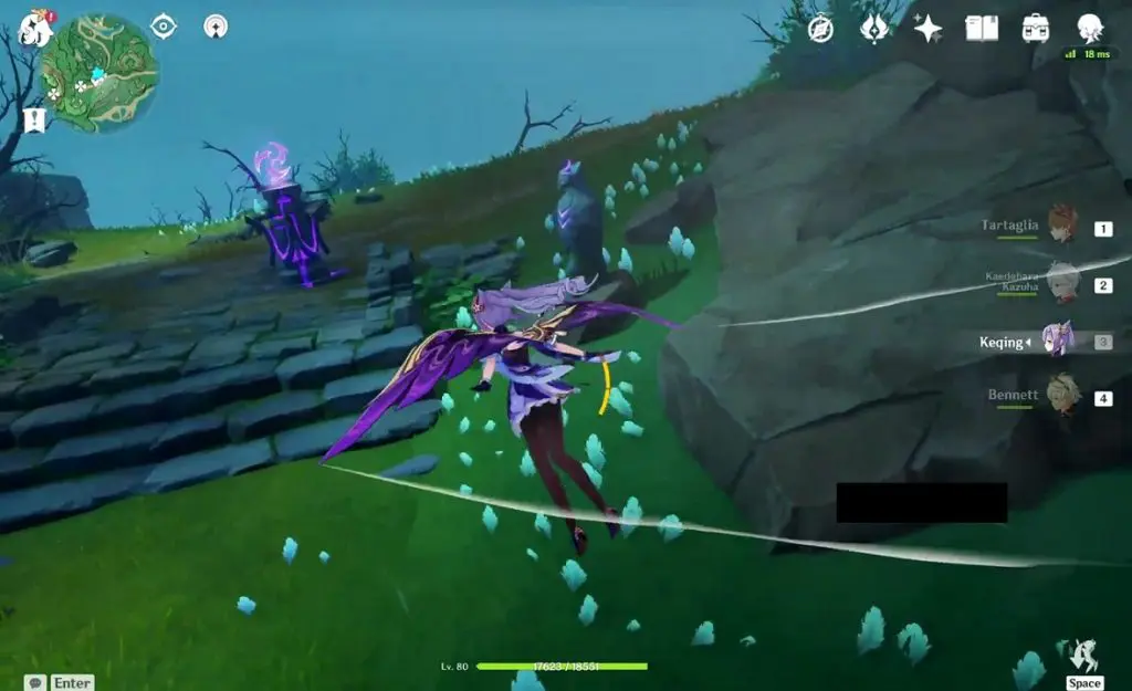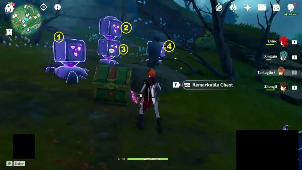 At the location highlighted below, you will find two Electro Barriers and a Thunderbird Statue. Don’t use the feather now. Hit both the pillars with an electro attack, which will make a chest spawn. Come back later. Now the statue will be glowing. Now use the ‘Peculiar Pinion‘ gadget in front of the statue to reveal 2 Electro Pillars. Now hit the four pillars with an electro attack. This will solve the puzzle, revealing a Remarkable Chest.