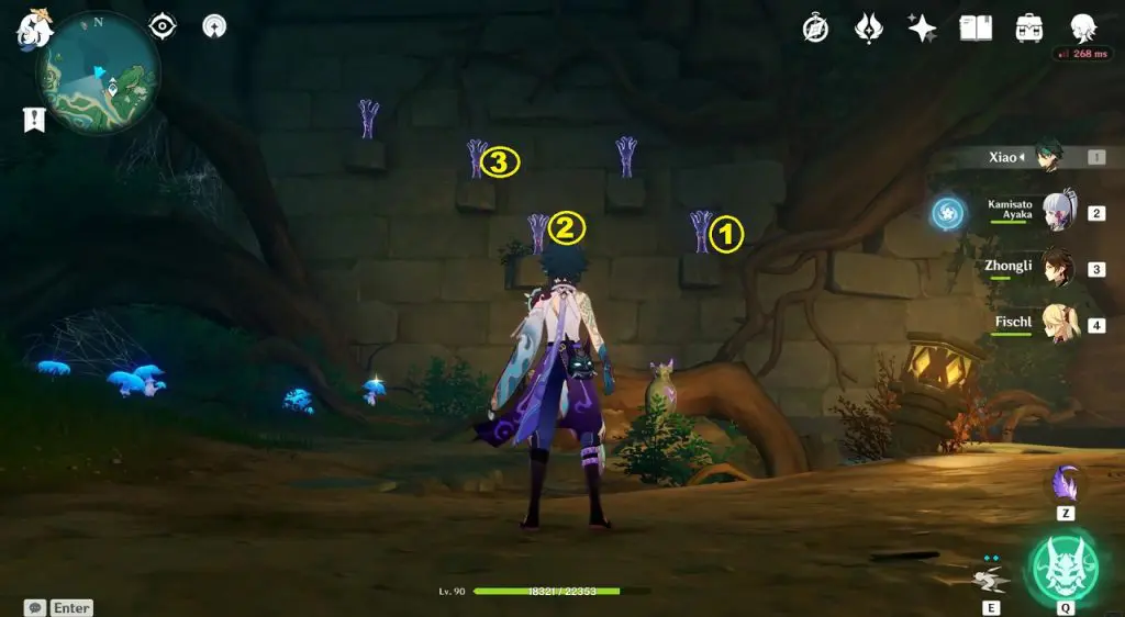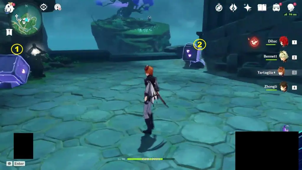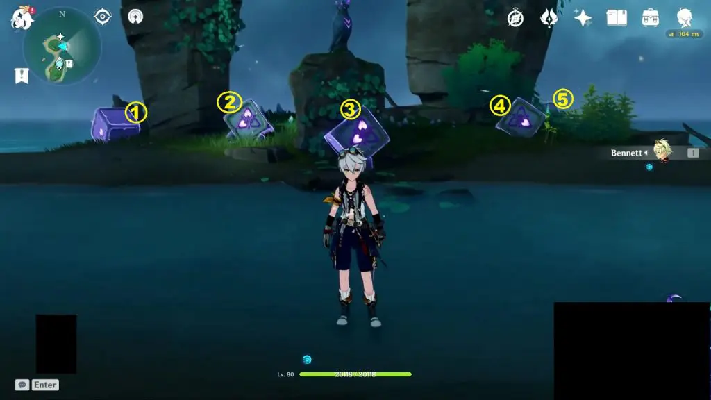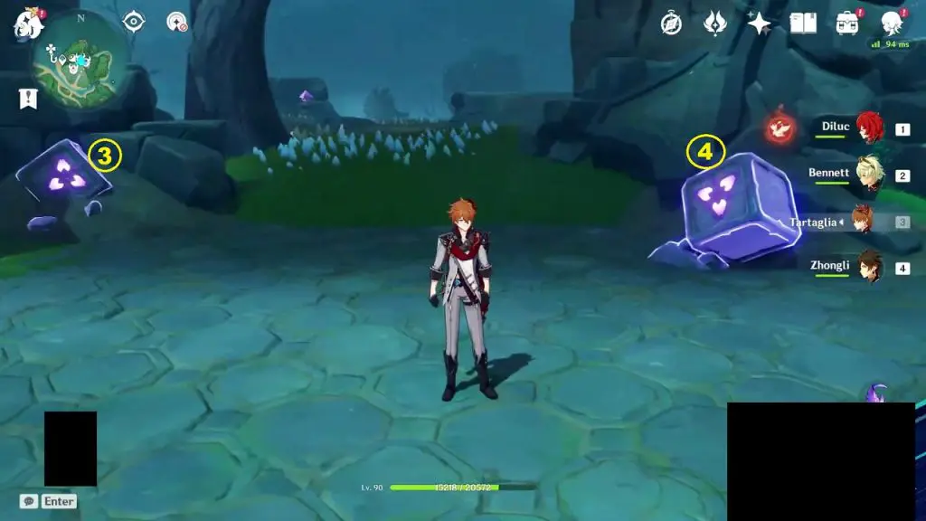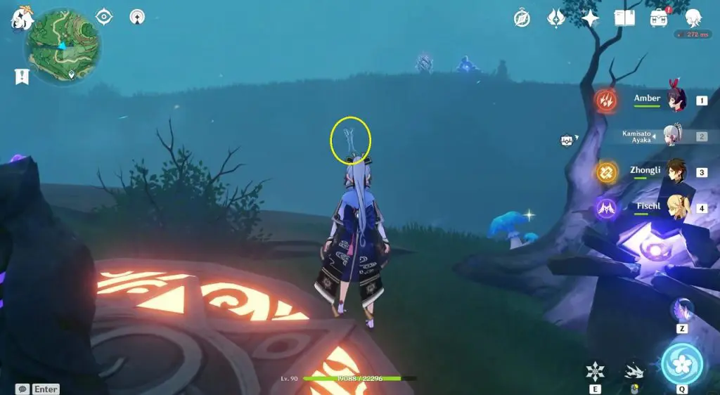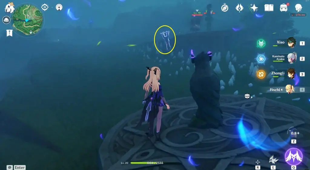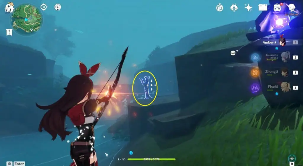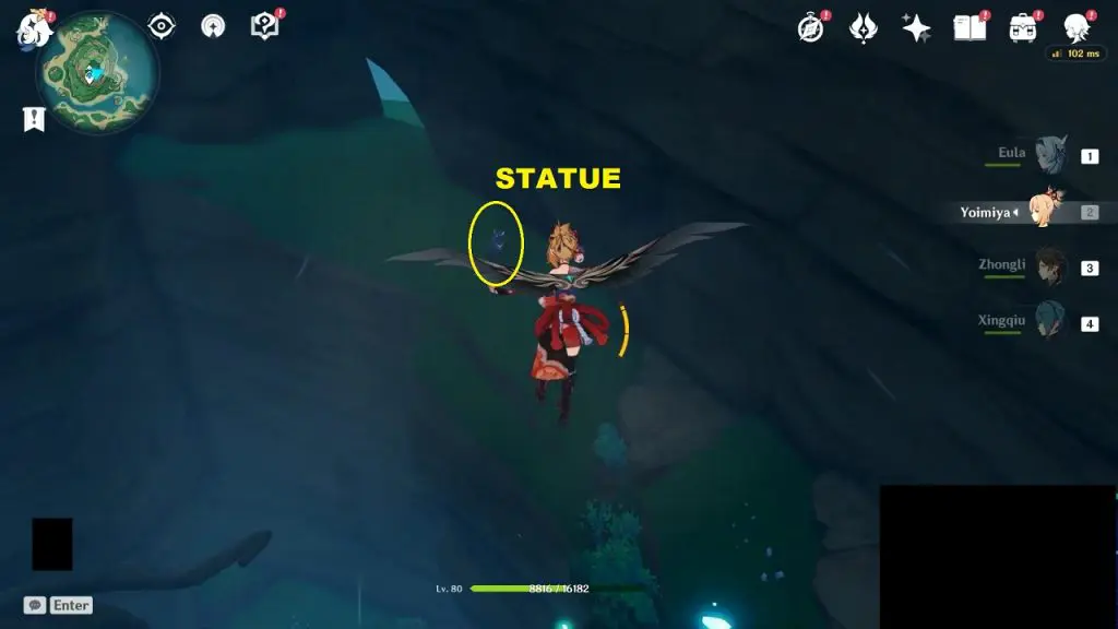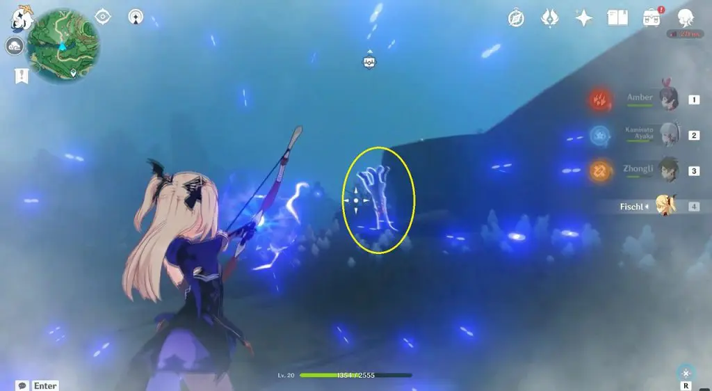 Go to the highlighted location and use the ‘Peculiar Pinion‘ gadget in front of the statue. This will reveal a Stormstone. Hit the Stormstone with an electro attack. This will make the statue near it glow. Now use the ‘Peculiar Pinion‘ gadget in front of this statue, revealing another Stormstone. Hit this Stormstone, revealing another statue. Keep doing this until you have hit 4 Stormstones. Hitting the 4th hidden Stormstone completes the puzzle and an exquisite chest will spawn.
