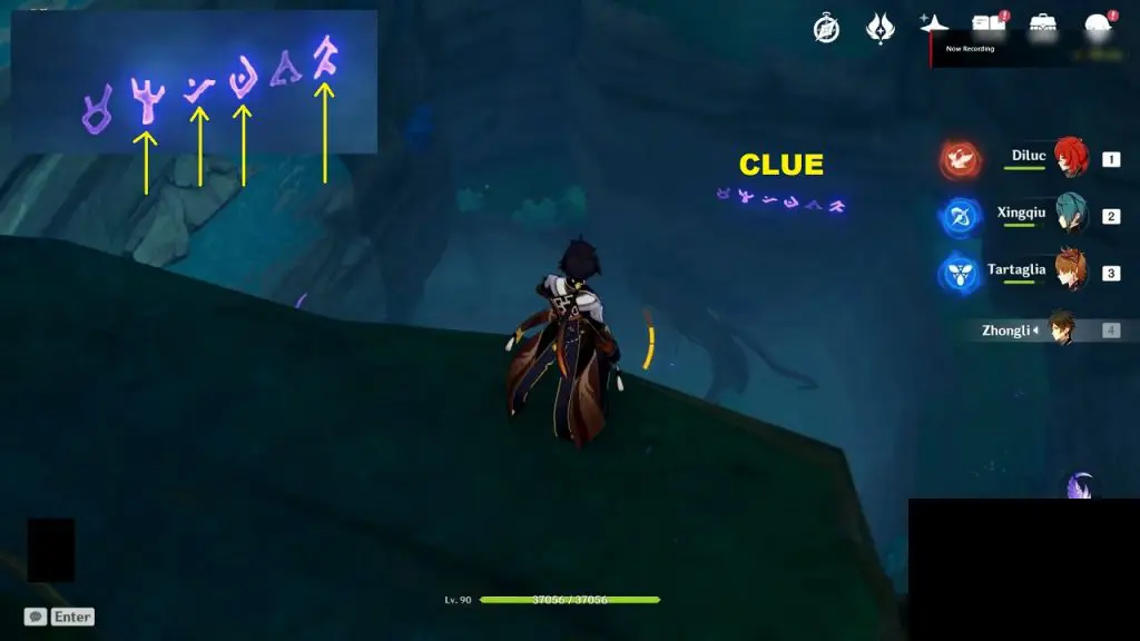 Use the ‘Peculiar Pinion‘ gadget in front of the Thunderbird Statue at the location shown below. This will make some symbols appear on the mountain walls. The clue will be on the wall as shown in the third picture. Some of the symbols in the clue will be glowing. You need to activate the same symbols around the wall (Sequence doesn’t matter). Completing the puzzle spawns an exquisite chest.