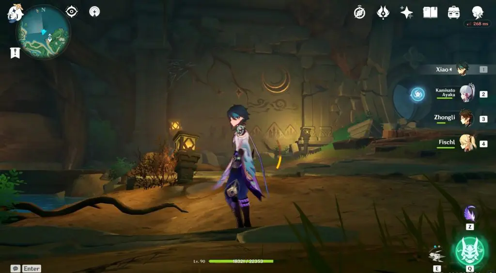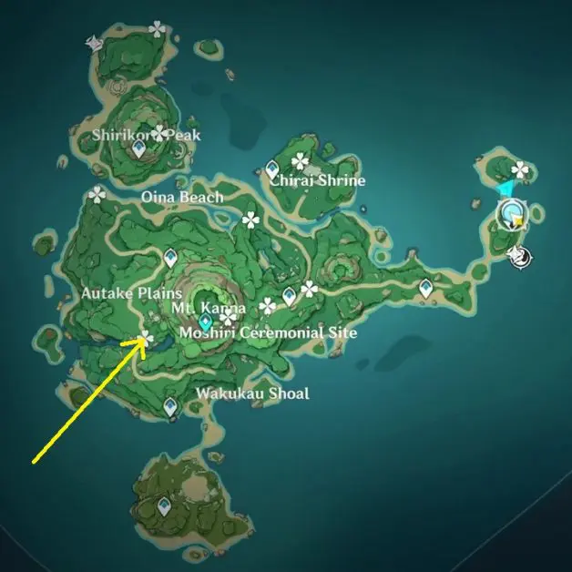 Go to the highlighted location in Autake Plains and use the ‘Peculiar Pinion‘ gadget in front of the statue. This will make 4 Torches appear. One torch is in front of the statue and one at the back. Jump down the west side of the statue to find another statue. Swim across the river on the south side of the statue to find the final torch. Hit the 4 torches with pyro, making an exquisite chest to spawn near the statue.