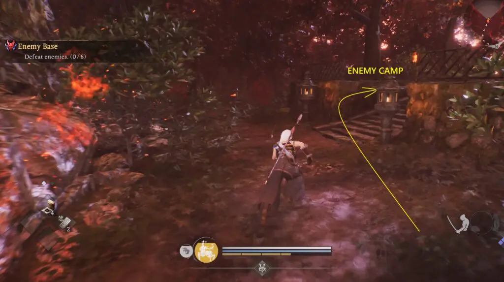 Look to the left of the shrine to find an opening in the mountain wall. Go inside and follow the path to exit on the other side. Then climb the stairs on the right. You will see an enemy in front of a hut. Defeat it and clear the other enemies in the area to capture the base.