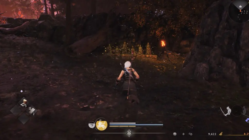 Continue along the path heading southwest until you find the Six Jizo statue. Pray in front of it.