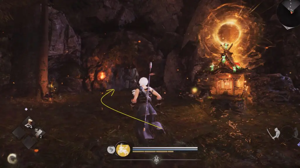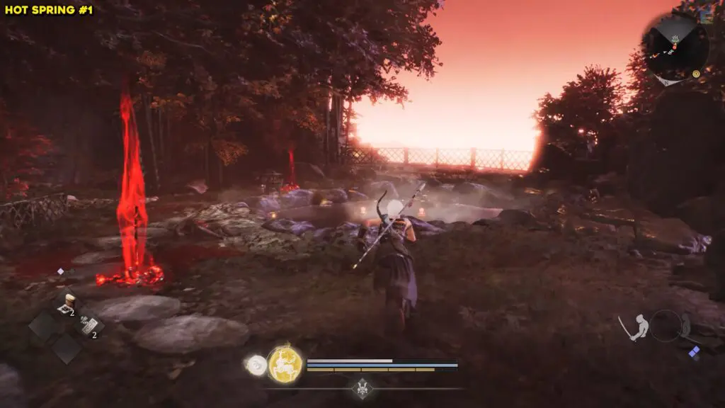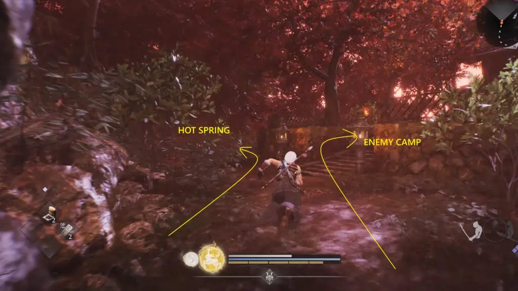 Look to the left of the shrine to find an opening in the mountain wall. Go inside and follow the path to exit on the other side. Instead of climbing the stairs, continue straight ahead to reach the hot springs at the end of the path.